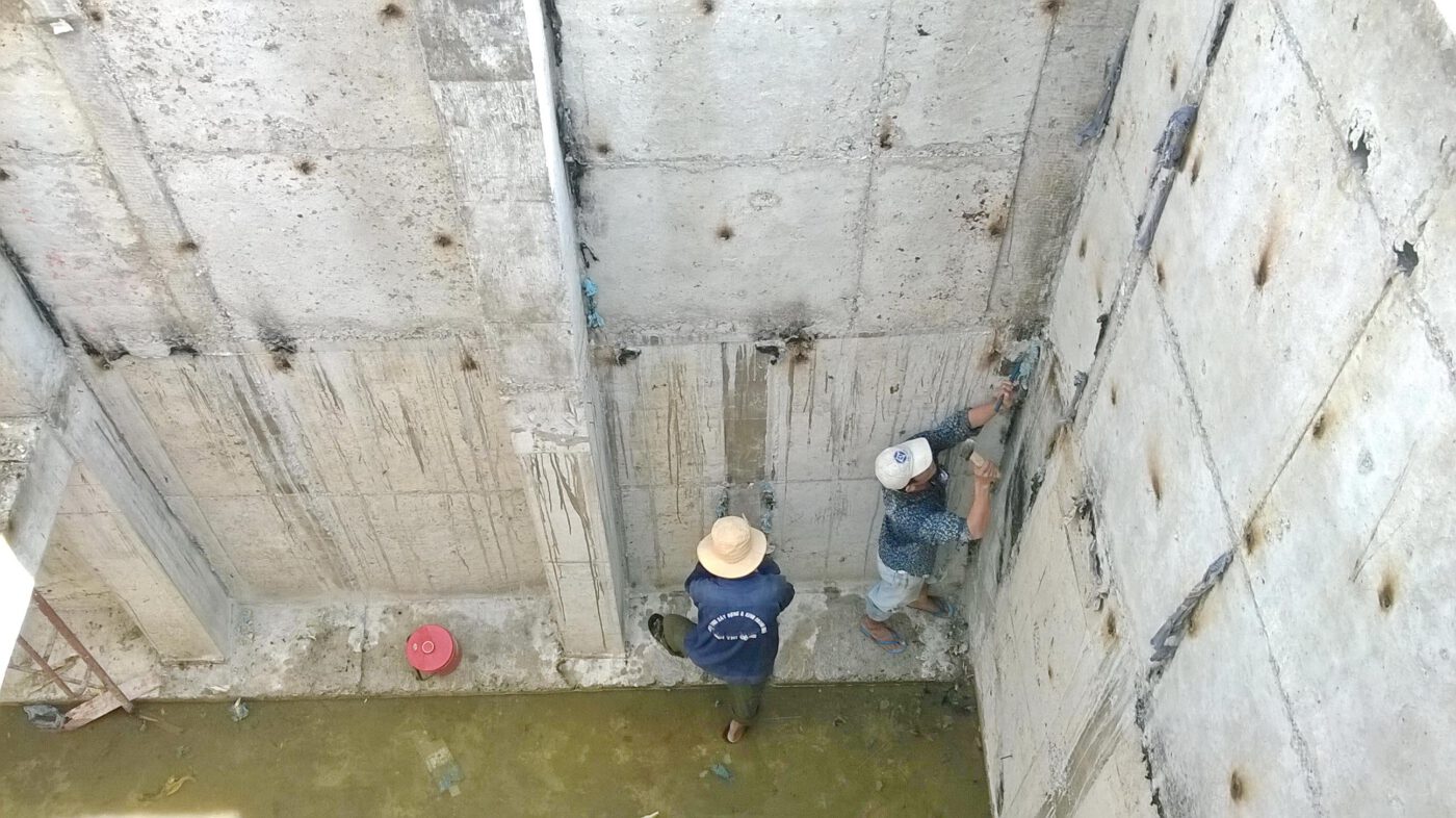 - Đục sạch các lớp hồ vữa ximăng, bê tông dư thừa cho bằng phẳng ra bề mặt bê tông để chuẩn bị cho công tác chống thấm.